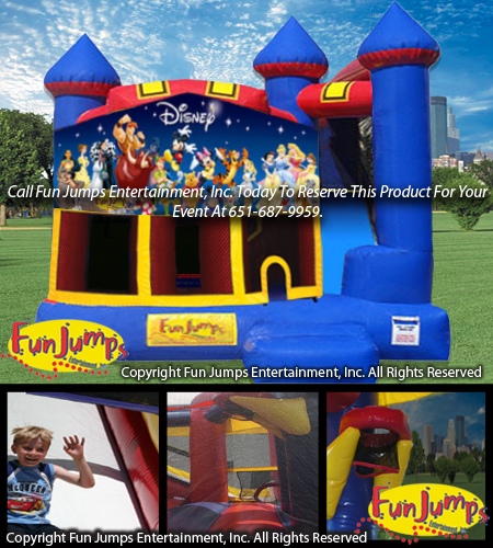 The World Of Disney Castle 4 In 1 Combo unit is a great inflatable for any event. Participants jump, crawl, climb, slide and play basketball in this action-packed unit. Reserve yours today!